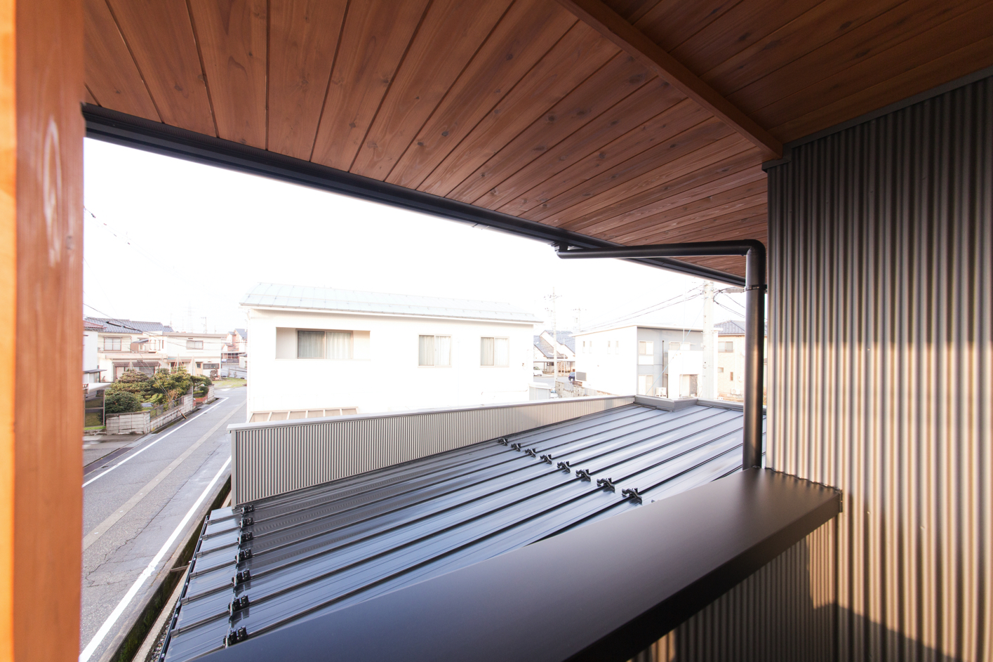 2方向からアプローチができ、深い軒の出(屋根)で守られている新庄の家。この2つがこの家の最大の特徴です。またガルバリウム鋼板の外観ではありますが、冷たい印象を和らげるため木部をバランスよく配置しました。LDKには床下収納と隠したキッチン収納がありコンパクトにまとめています。