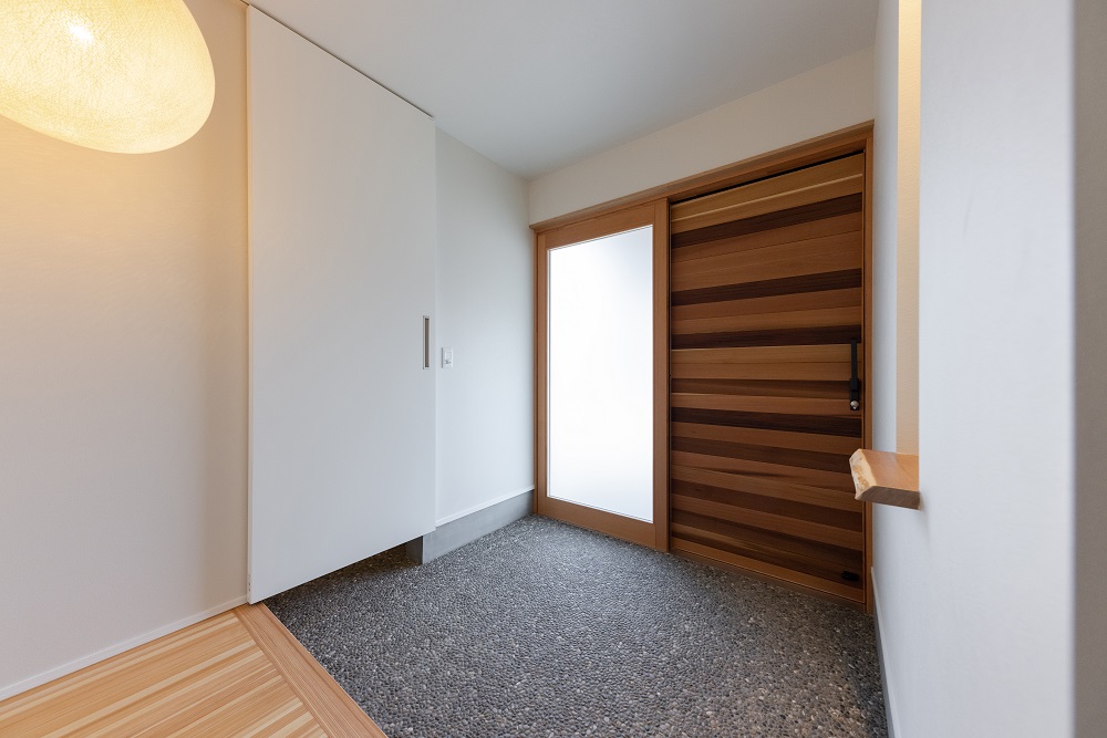 スタートは「サザエさん家みたいな平屋が欲しい~」でした。家族5人がこれから冬暖かく夏涼しく暮らすことができる工夫を詰め込んだお宅です。外観はシンプルな長方形、大きく出た軒が印象的な屋根も単純な切妻屋根。拘りのレッドシダー横貼り木製玄関引き戸、豆砂利洗い出し玄関土間は和風テイスト。一歩入ると白い内装・優しさを感じる杉浮造り仕上げの床で印象は変化する。LDKにはお気に入りの一枚板の座卓があり床に座る文化を継承している。エアコン1台稼働で玄関・脱衣・サンルームなどの扉も開けた開放的な生活を送ることができる性能を持つ36坪のお宅です。